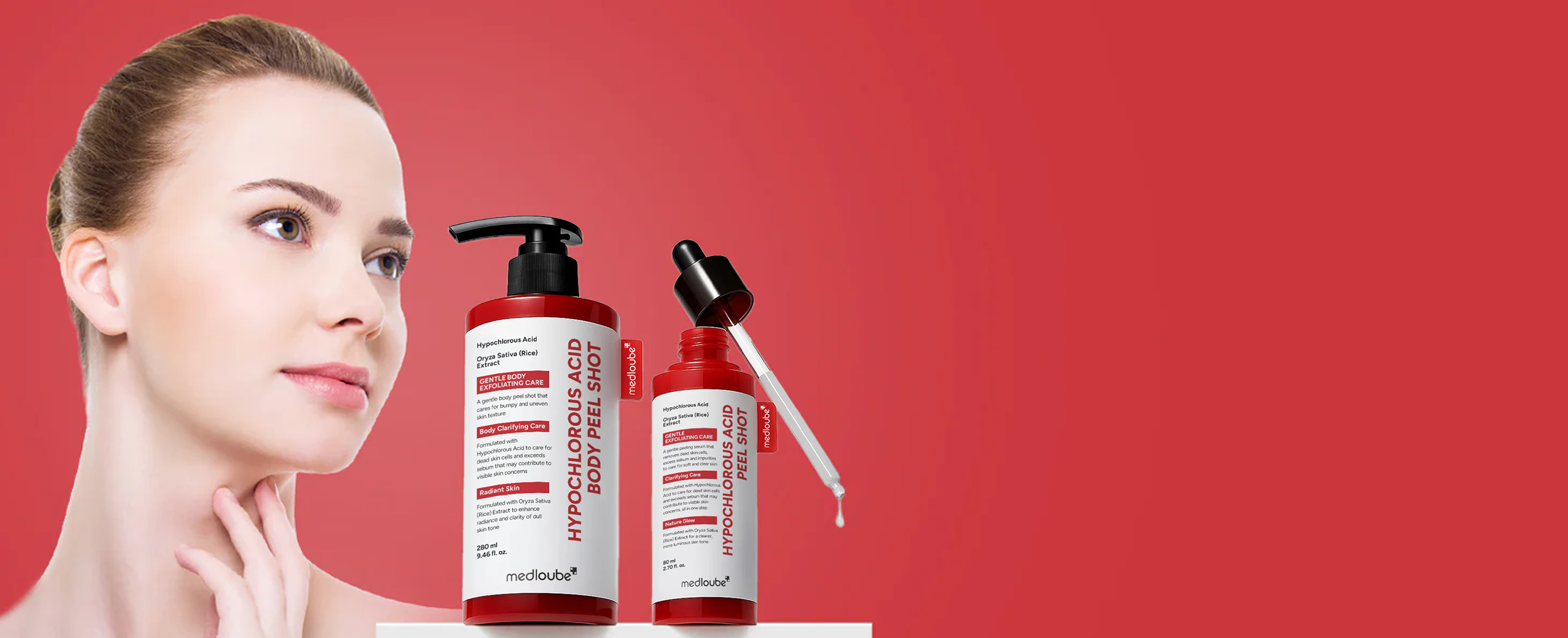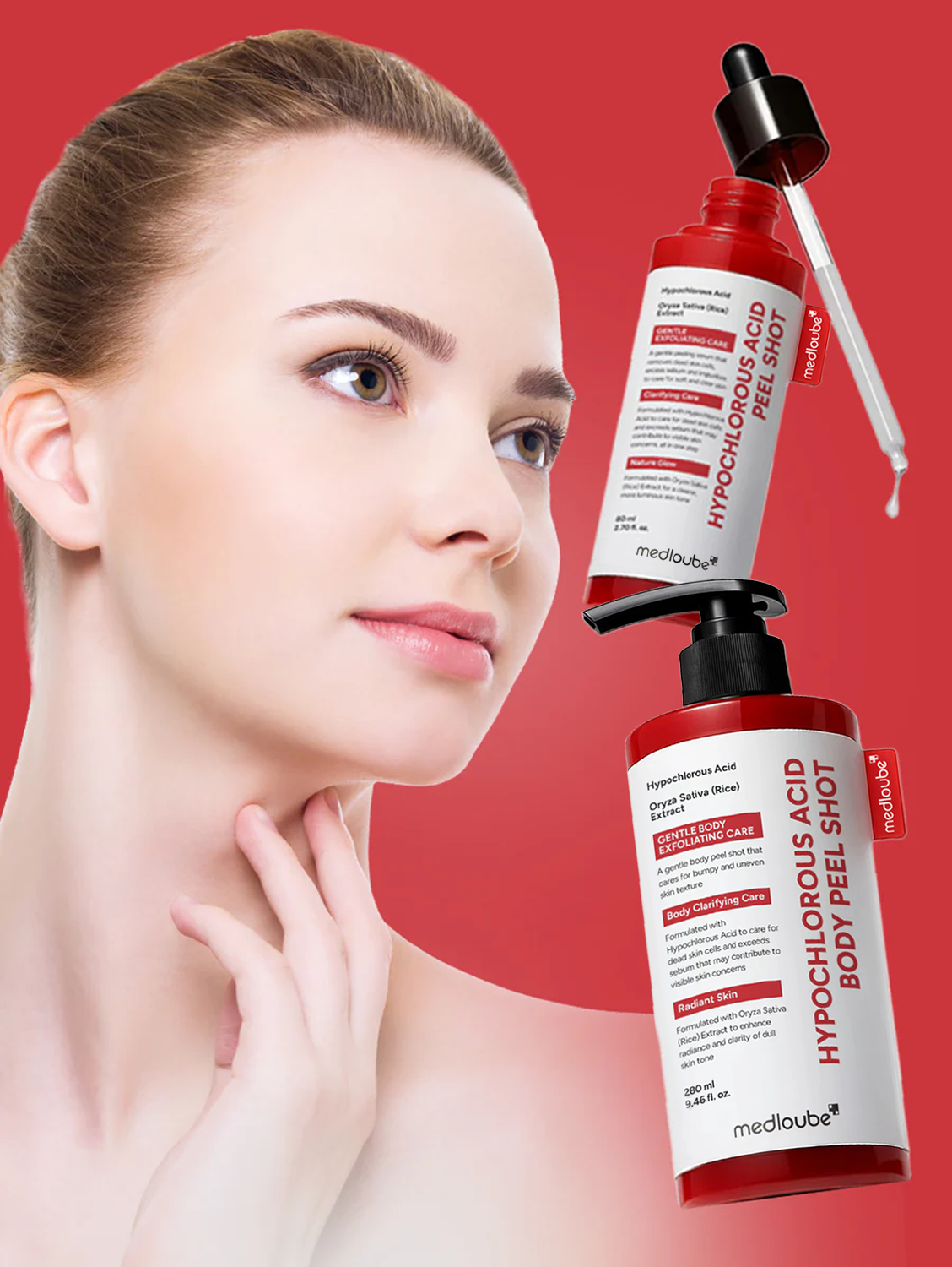 The medloube Hypochlorous Acid Body Peel Shot works by combining gentle exfoliation and skin-reviving hydration in one step. Hypochlorous Acid helps break down dead skin buildup, unclog pores, and clear away impurities that cause dullness and rough texture.