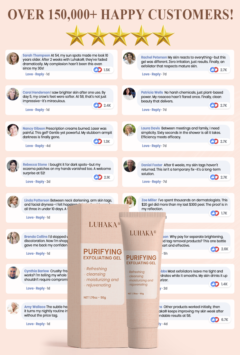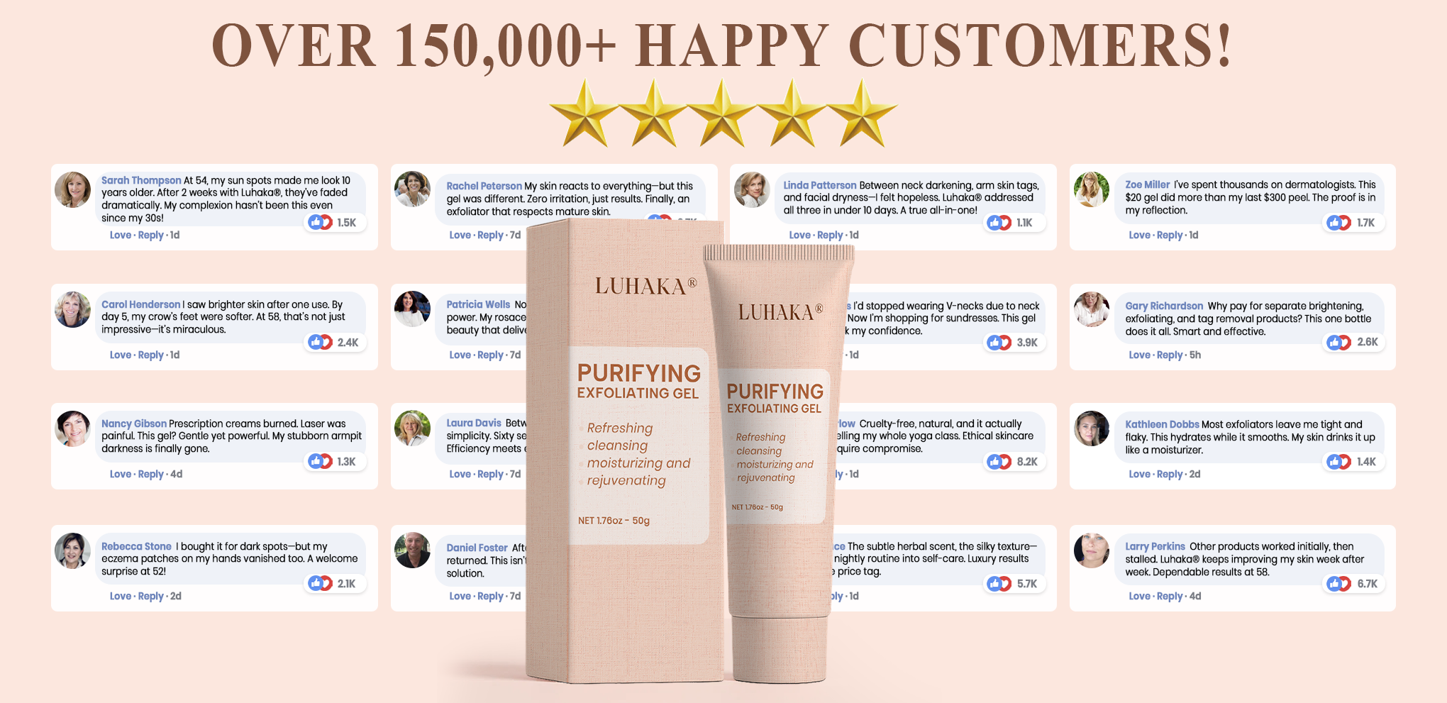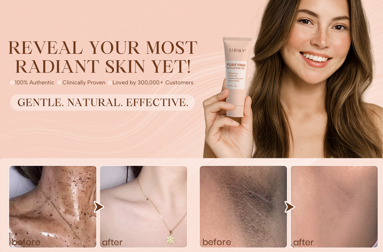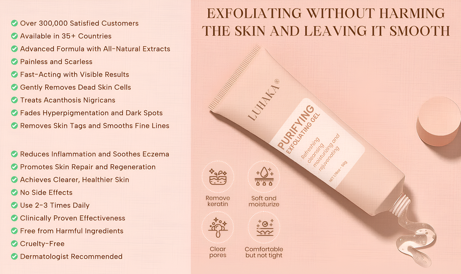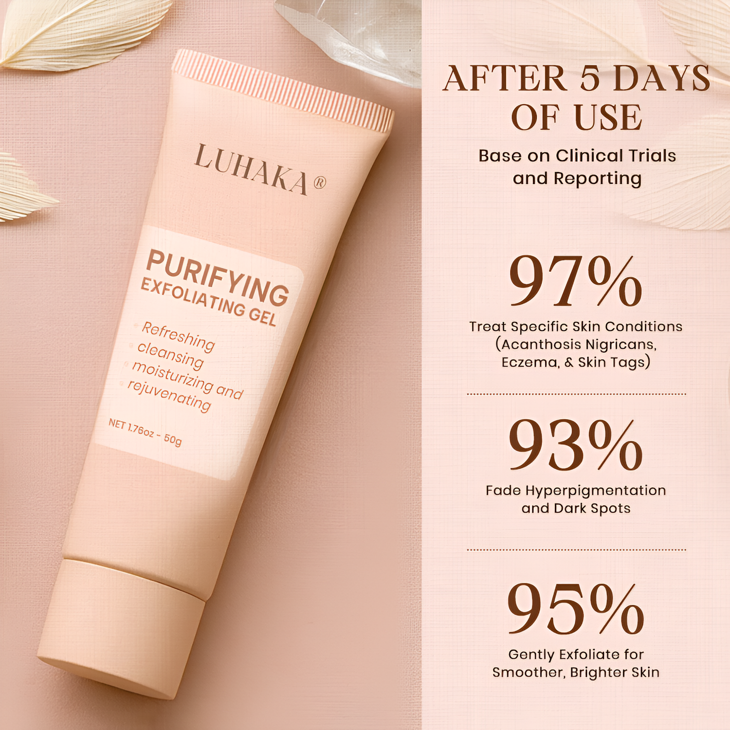 Luhaka® Purifying Exfoliating Gelfeatures an advanced natural formula designed to gently exfoliate andremove dead skin cells, promoting cellular metabolism. Over time,it helps treat Acanthosis Nigricans, fades hyperpigmentation and dark spots, smooths out fine lines, and addresses skin tags and eczema. Infused with nourishing natural ingredients, this gel hydrates and brightens the complexion while improving overall evenness. By unclogging pores and preventing impurity buildup, it reduces inflammation, leading to clearer, smoother, and more radiant skin.