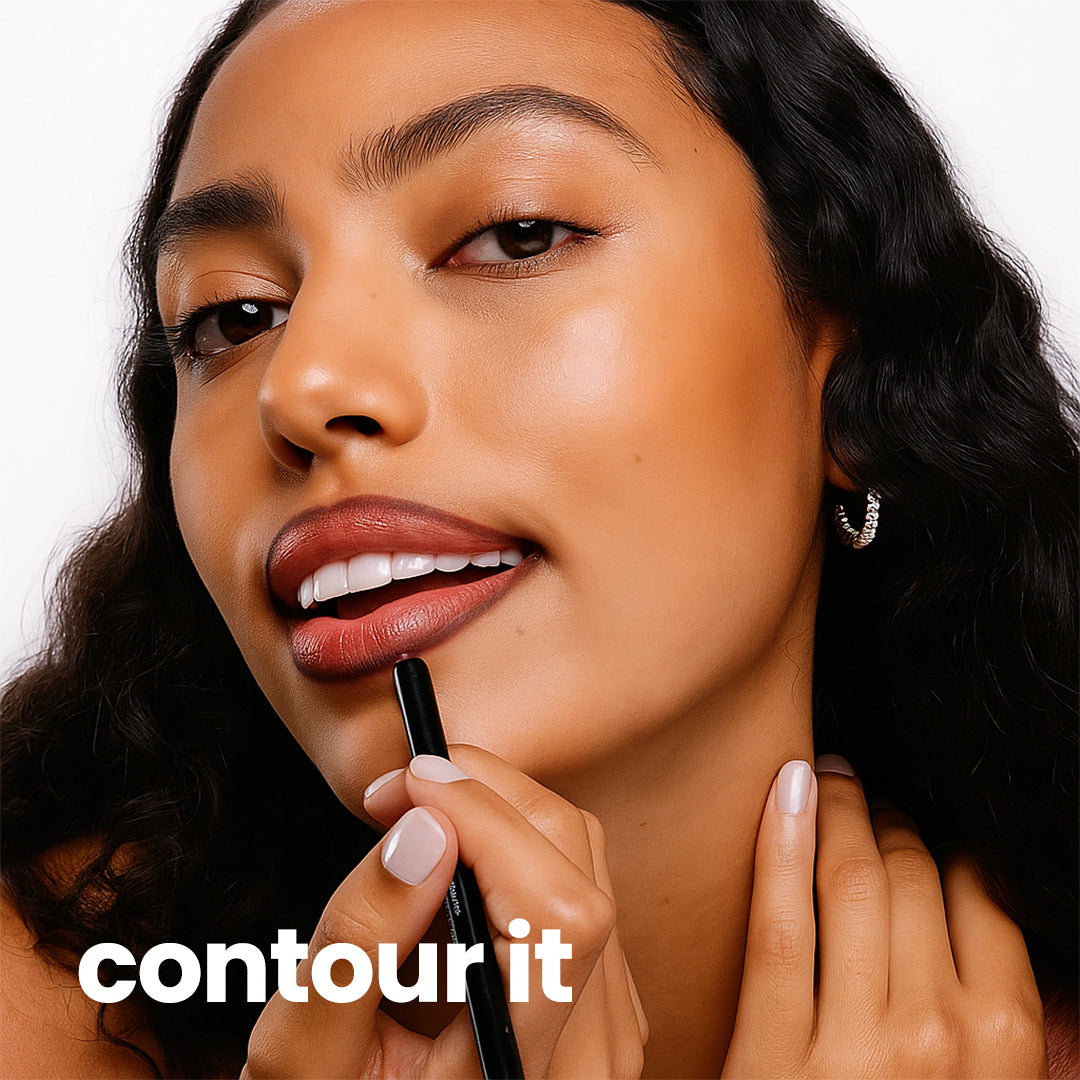 Step 1: Use Contour Lip to shape your lips your way: line precisely to define, overline for fullness, fill for bold color, or feather the edges for a soft ombre - whatever fits your point of view.