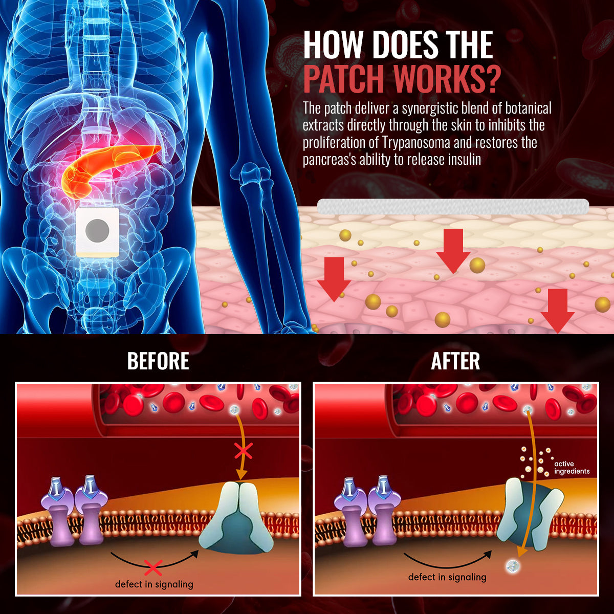 The patch utilizes a transdermal delivery system to gradually release a blend of herbal extractsthe skin to promote insulin sensitivity, improve glucose uptake by cells, and stabilize blood sugar levels to blocks all vital functions of these parasites
