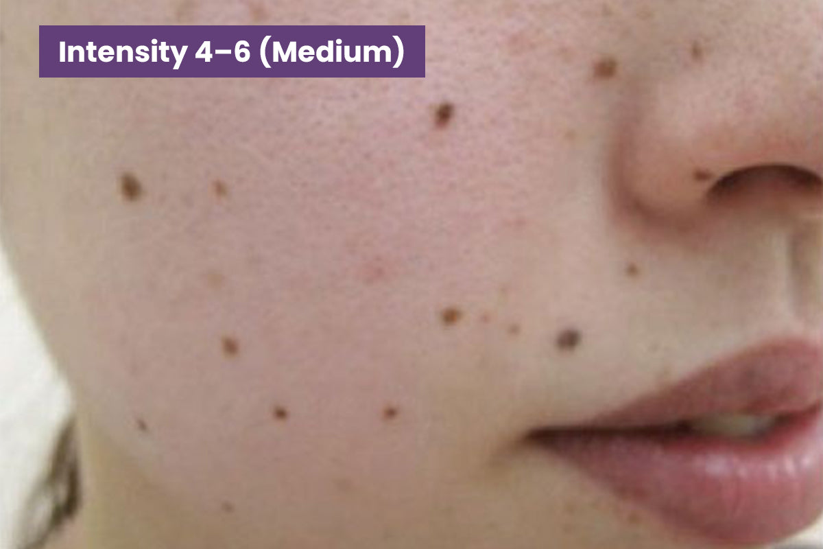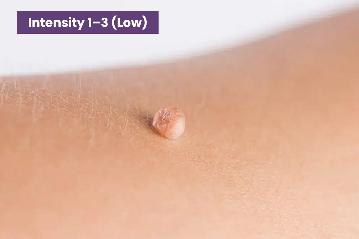 Intensity 1–3 (Low) – Gentle treatment for small skin tags, tiny moles, or sensitive areas. Minimal discomfort, ideal for first-time users.