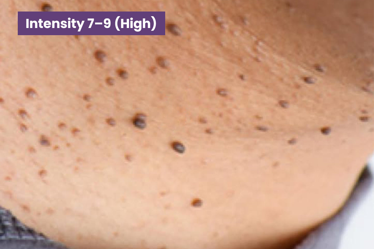Intensity 7–9 (High) – Maximum power for stubborn or larger spots. Use with caution; may cause stronger tingling or slight redness. Best for tough spots.