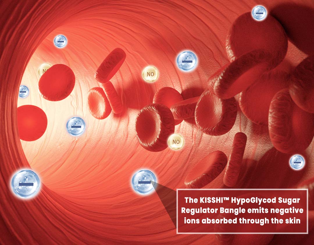 The KISSHI™ HypoGlycod Sugar Regulator Bangle emits negative ions absorbed through the skin,⁶ enhancing circulation and potentially lowering blood sugar levels. Additionally, these ions regulate insulinsecretion and improve insulin sensitivity,⁷ crucial for maintaining optimalblood sugar levels.