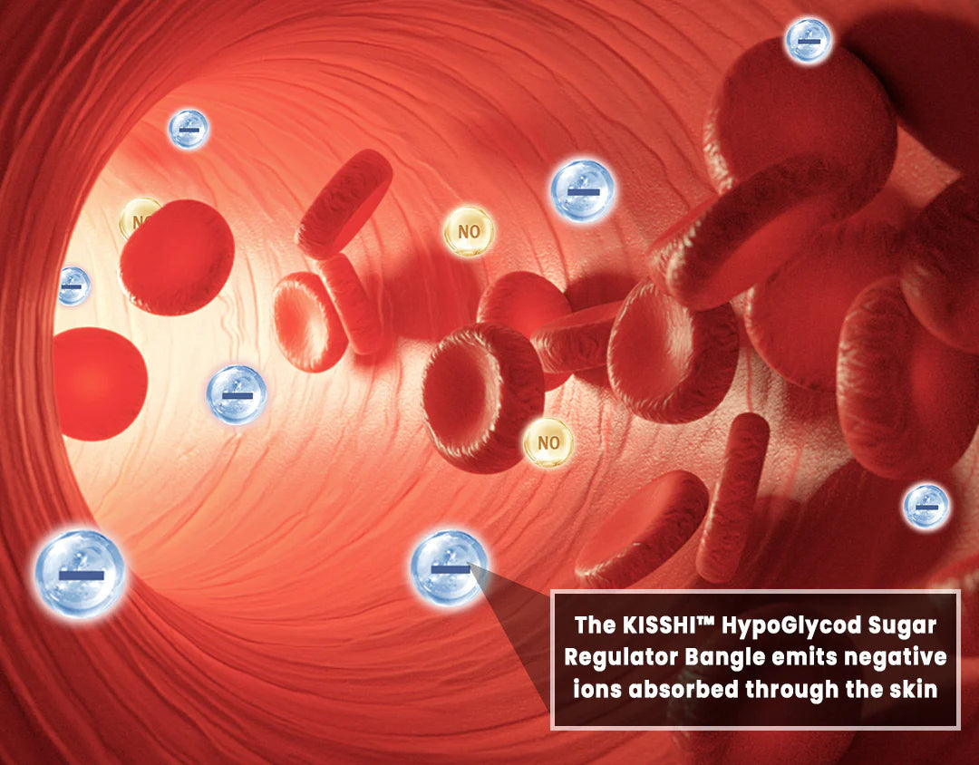 The KISSHI⢠HypoGlycod Sugar Regulator Bangle emits negative ions absorbed through the skin,ⶠenhancing circulation and potentially lowering blood sugar levels. Additionally, these ions regulate insulinsecretion and improve insulin sensitivity,ⷠcrucial for maintaining optimalblood sugar levels.